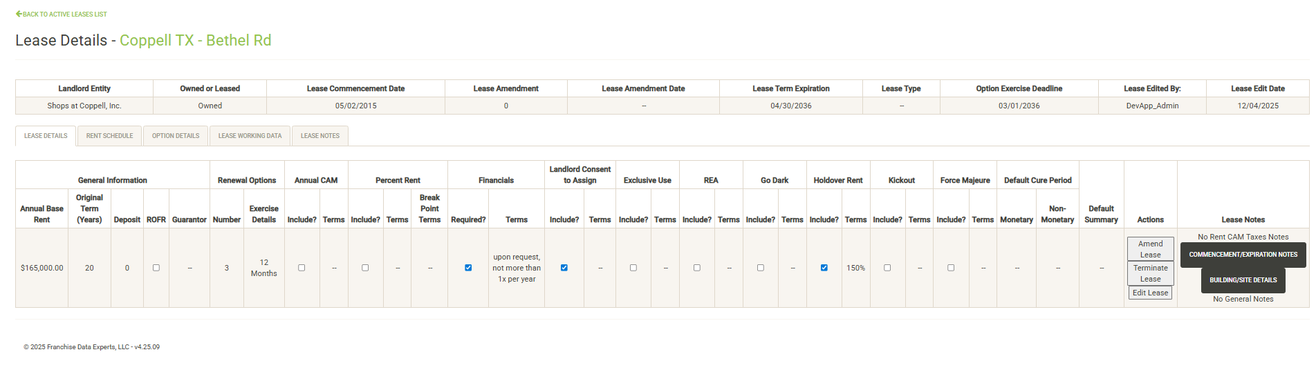Click View Details to the right of the lease info to view/edit the full Lease Details. Lease Details for terminated leases cannot be edited or amended, aside from Lease Working Data. Click Summary to view the Terminated Lease Summary.