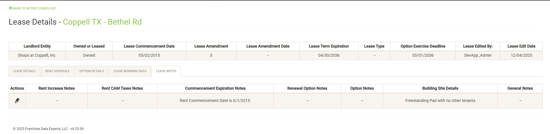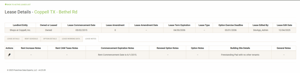 The Lease Details page includes five tabs. The first is opened by default and includes various details about the lease. If you have the proper permissions, the actions column includes various actions you can take for the current lease. See the Amend Lease or Edit Lease sections for more information. The Lease Notes column includes notes about various areas of the lease. If there are no notes in the system for the category, a message will reflect this. If there are notes, click on the button to display the notes in a pop-up window.