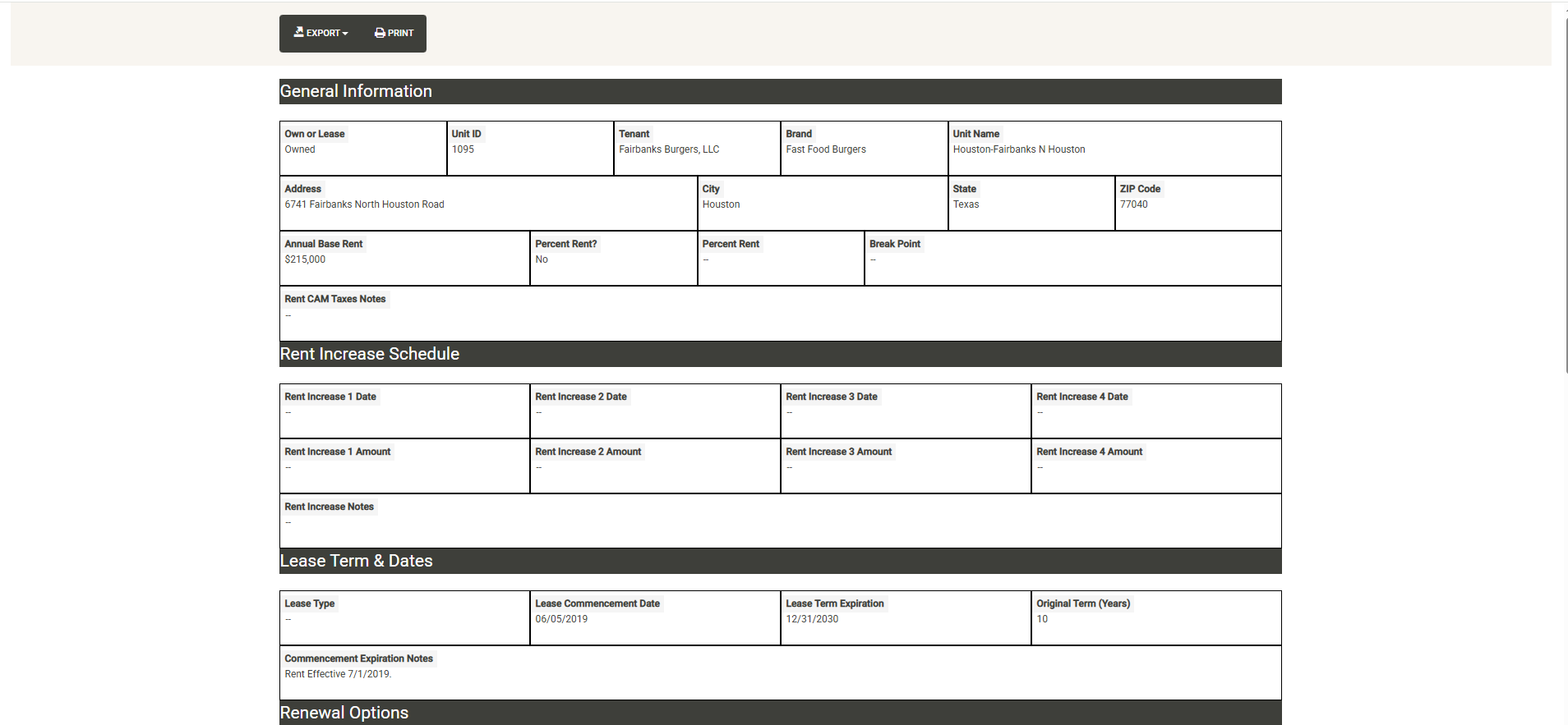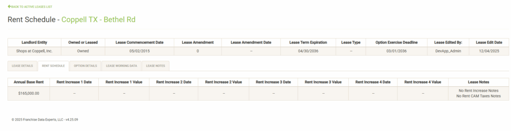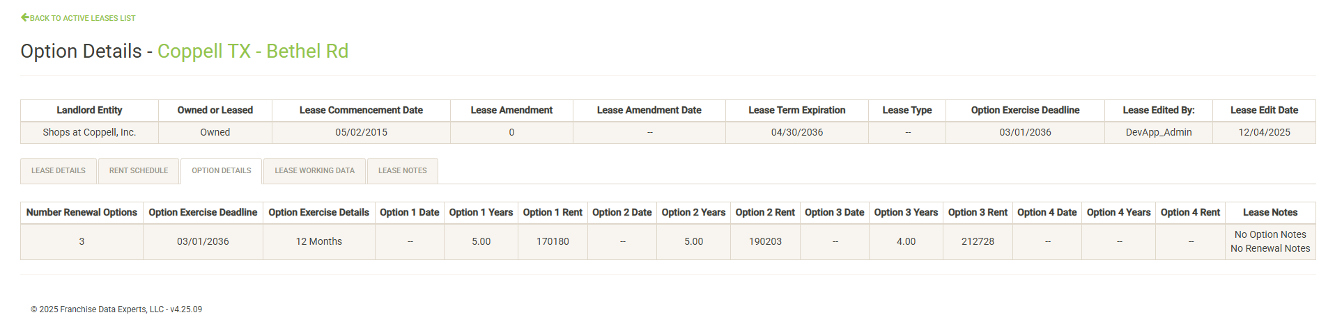 The Option Details tab includes information about the options that have been defined in the lease. The Lease Notes column includes notes related to the options. If there are no notes in the system for the category, a message will reflect this. If there are notes, click on the button to display the notes in a pop-up window.