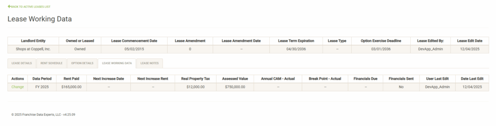 You can modify or update this data (with the proper permissions) at any time without editing or amending the lease. Click on the Change link to the left of the data to update the lease working data.